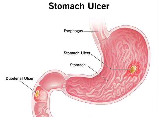 The most common causes of peptic ulcers are infection with the bacterium Helicobacter pylori (H. pylori) and long-term use of nonsteroidal anti-inflammatory drugs (NSAIDs) such as ibuprofen (Advil, Motrin IB, others) and naproxen sodium (Aleve). Stress and spicy foods do not cause peptic ulcers.